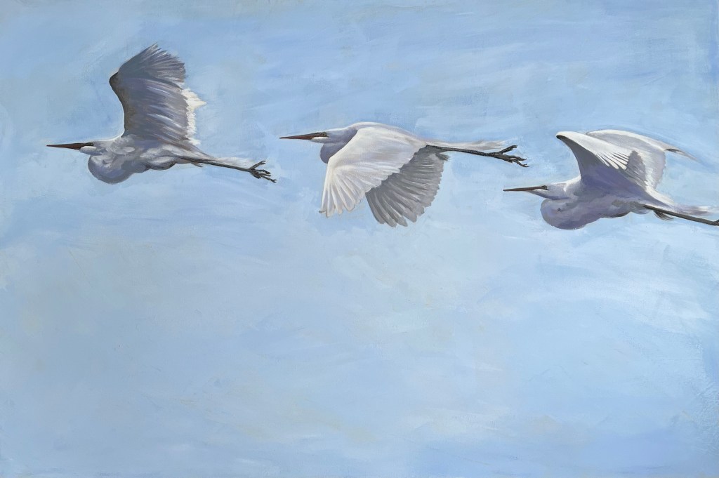 March 1, 2024 – Well, once again I am not keeping up with the website nor social media. I have had a lot of fun painting egrets, landscapes, and now boats. The boats were a challenge but ended up being fun once I got some good advice on troublesome parts. I want to do more and will spend some time photographing at the harbor and marina for future work. As usual the beautiful birds in Delaware, Maryland, and at the rookery in York, Pennsylvania take my attention. Getting up close to be able to see all the details in their feathers and features is important to me, even as I try to move to more impressionist works. They are so graceful and magnificent flying above.